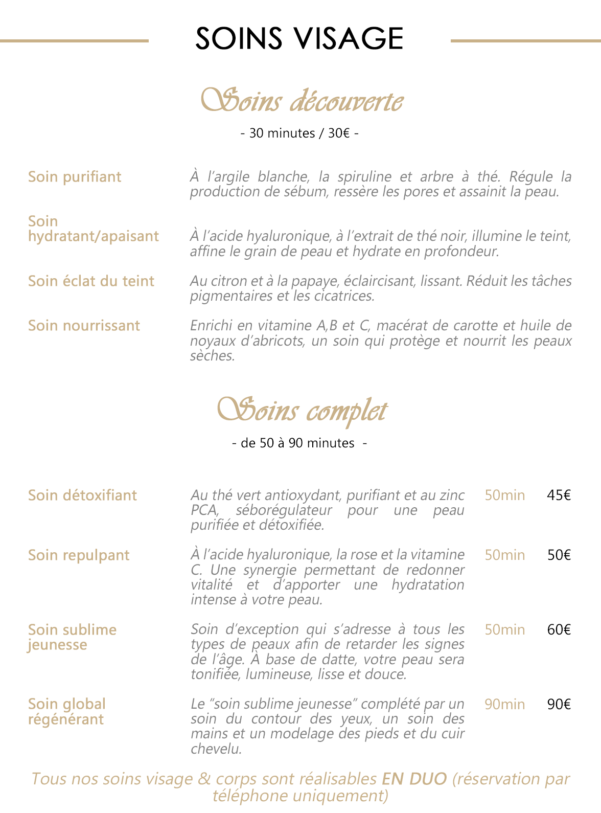 Nos soins visage s'adaptent à votre type de peau. Sélectionnez le soin qui vous correspond et redonnez de l'éclat à votre visage.